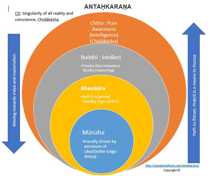 The entity through which common sense (adhyavasāya) and decision-making (Nishchai) happens is called Buddhi. This means it is the intellect of a being, a processing unit that churns memory and experiences into various possibilities for decision-making. It is not necessary that Buddhi will always result in the perfect outcome. The role of Buddhi is to project an outcome for a given input based on its memory. Buddhi and mānas are in constant struggle. Based on Buddhi’s outcome, mānas tries to make a Sankalpa (fixed decision) or reject it and exist in uncertainty, fantasy, and an unreal state called Vikalpa. If mānas likes buddhi’s outcome, then the entire being (all its energies) falls in line and results in a pleasant experience, else it results in a struggle (Gharshana). There are times when the mānas is forced to accept buddhi’s outcome, either by threat or when there are no other realistic means, but the mānas continue to stay in a resentful state, dwelling in fantasy. This resentful state of the mānas will cause the buddhi to overwork itself, making the entire being reject the current reality. This generates friction among various energies in a being. Such a state, when intensified, causes various chemical imbalances and moves toward a systemic crash or anxiety or depression, and other psychological illnesses. (Jagad Guru Shankaracharya Swami Shree. 2020)